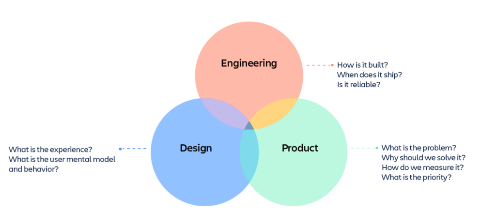 من الجيد لك أن تعرف أين يتقاطع عملك مع بقية الأقسام، خصوصًا إذا كنت قائدًا لقسمٍ ما داخل الشركة أو المنظمة فهذا يخلق جوًا صحيًا من التعاون البنَّاء والصحي والذي سيصب في مصلحة العمل لأنه يمنع الاختلافات والمشاكل المُختلقة والسخيفة كما أنه يجنبك سوء الفهم لاحقًا. إذا كنت مديرًا لقسمٍ ما، إذهب وتحدث مع كافة الأقسام في الشركة حول مهامكم بشكل عام ثم تحدث معهم حول مناطق التقاطع فيما بينكم ومثالٌ على ذلك التقاطعات التي تحدث بين قسمي تطوير المنتج والقسم البرمجي على سبيل المثال. أنظر للصورة التالية للتوضيح